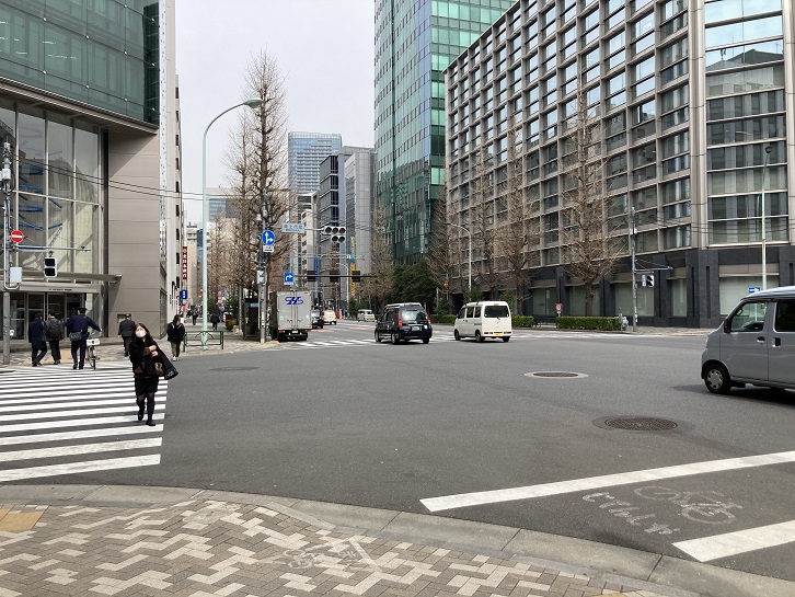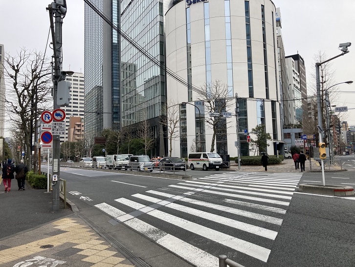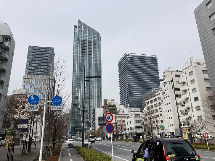 日比谷通りが環状二号線と交差するところから虎ノ門ヒルズが眺められます。虎ノ門一帯には超高層ビルが続々と建てられていて、これから街の景観は一変することでしょう。