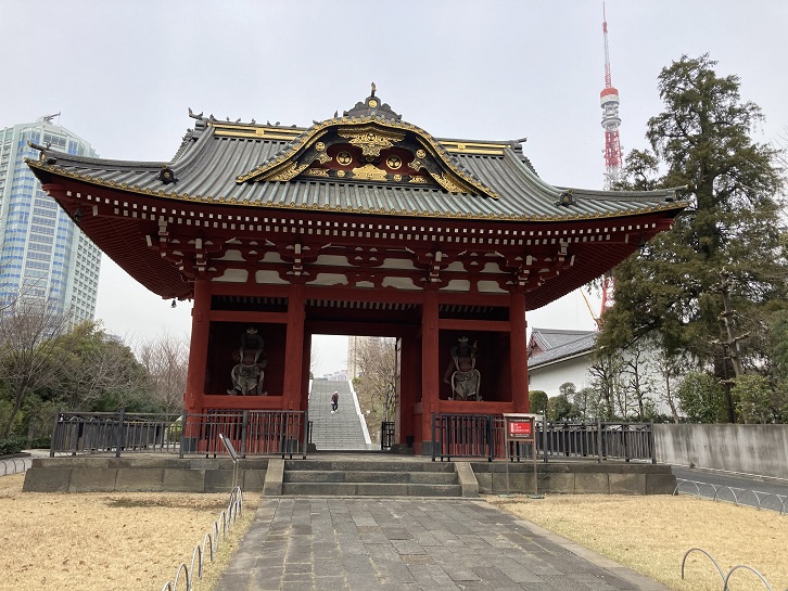 港区役所前交差点の先、東京プリンスホテルの前に中世鎌倉時代を思わせる赤門が聳えています。