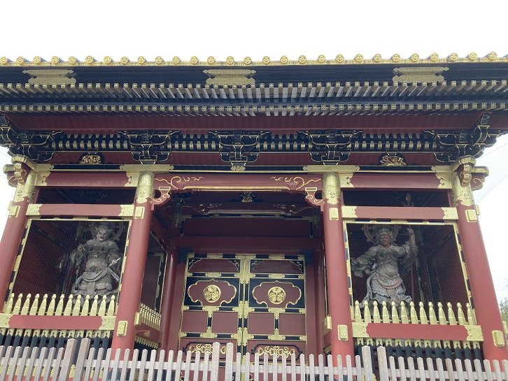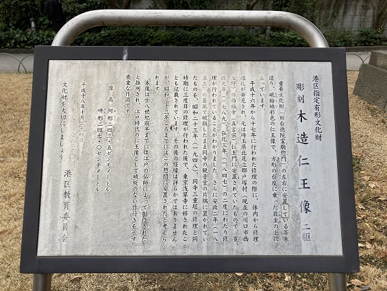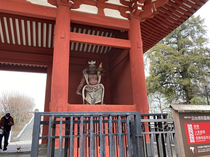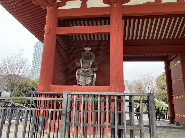 重要文化財「旧台徳院霊廟惣門」の左右に安置している寄木造り、砥粉地彩色の仁王像で、方形の台座に乗った岩坐の止に立っています。平成十六年から十七年に行われた修理の際に、体内から修理銘札が発見され、元は埼玉県北足立郡戸塚村(現在の川口市西立野)の西福寺(真言宗)仁王門に安置されていたもので、寛政元年(1789年)、弘化三年(1847年)の二度にわたり修理が行われていることがわかりました。さらに安政二年(1855年)の暴風で破損したまま同寺の観音堂の片隅に置かれていたものを、昭和二十三年(1948年)、同寺三重塔の修理と同時期に三度目の修理が行われた後で、東京浅草寺に移されたことも記載されています。その後の経緯は詳らかではありませんが、昭和三十三年ごろまでにはこの惣門に安置されたと考えられます。本像は十八世紀前半までには江戸の仏師によって制作されたと推測され、江戸時代の仁王像として破綻のない作行きを示す貴重な作品です。