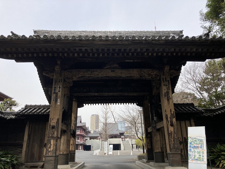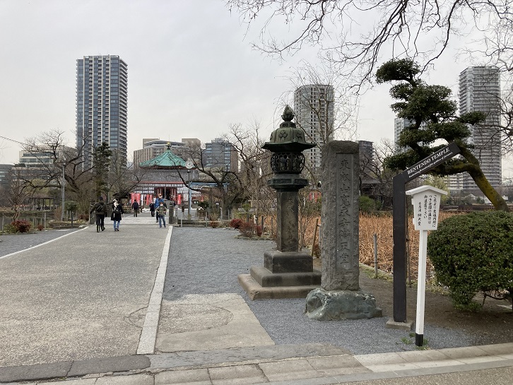 現在(歩いた時点)、増上寺では「本堂屋根瓦総葺き替え工事」が行われています。これは、浄土宗の開祖である法然上人(1133年〜1212年)が承安五年(1175年)に立教開宗して以来、850年を迎える令和六年(2024年)に合わせての慶讃事業のひとつとなっています。増上寺の大殿本堂は、昭和四十九年(1974年)の建立以来半世紀を迎えます。長年の風雪に耐えた屋根瓦は傷みが激しく、瓦の総葺き替えが必要不可欠となっていました。今回の総葺き替えでは、瓦の素材に丈夫なチタンを用い、厚さ0.3ミリメートルに加工して瓦を葺くことにより屋根の圧倒的な軽量化を実現し、さらには耐震補強を施して災害に耐えうる安全な本堂を目指しています。増上寺大殿屋根の施工面積は4,235u、チタン瓦の枚数にして約6万枚です。この数はチタン製屋根瓦の葺き替え例としては世界最大規模となります。(工事は2021年11月に無事竣工しました。)
