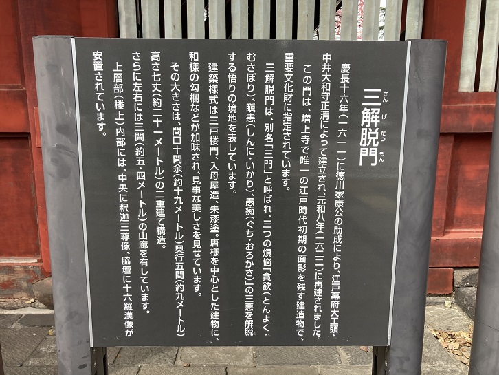 慶長十六年(1611年)に徳川家康公の助成により、江戸幕府大工頭・中井大和守正清によって建立され、元和八年(1622年)に再建されました。この門は、増上寺で唯一の江戸時代初期の面影を残す建造物で、重要文化財に指定されています。三解脱門は別名「三門」と呼ばれ、三つの煩悩「貪欲(とんよく・むさぼり)、瞋恚(しんに・いかり)、愚痴(ぐち・おろかさ)」の三悪を解脱する悟りの境地を表しています。建築様式は三戸楼門、入母屋造、朱漆塗。唐様を中心とした建物に、和様の勾欄などが加味され、見事な美しさを見せています。その大きさは、間口十間余(約19メートル)・奥行五間(約9メートル)・高さ七丈(約21メートル)の二重建て構造。さらに左右には三間(約5.4メートル)の山廊を有しています。上層部(楼上)内部には、中央に釈迦三尊像、脇壇に十六羅漢像が安置されています。