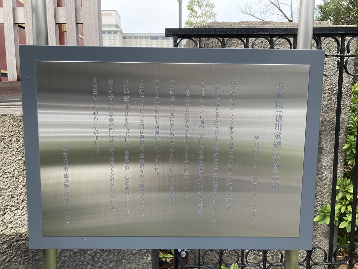 現在の東京プリンスホテル敷地には、戦前、六代将軍家宣の文昭院霊廟と並んで、七代将軍家継の有章院霊廟がありました。プリンスホテル正面の二天門は有章院霊廟の惣門です。霊廟は八代将軍吉宗が享保二年(1717年)に建立しました。その結構(全体の構造や組み立て・構成の意)は日光に劣らぬと伝わる程でしたが、昭和二十年(1945年)に東京大空襲で焼失しました。この焼け残った二天門は銅板葺・切妻造りの八脚門で、左右に仏法守護の役目を持つ広目天・多聞天の二点が祀られています。焼けた文昭院霊廟の門に持国天・増長天が置かれ、合わせて四天王として祀られていました。