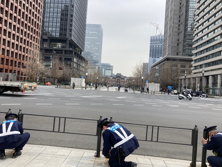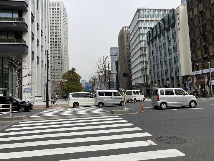 和田倉門交差点にやってきました。東京駅丸の内中央口から皇居前内堀通りまでを結び、和田倉門交差点で日比谷通りと十文字に交差する道路は、天皇が行幸するため東京駅までの移動に利用した道路であるところから行幸通り(「ぎょうこうどおり」または「みゆきどおり」)と呼ばれています。和田倉門交差点から東京駅前の東京駅中央口交差点までの区間は、正式には東京都道404号皇居前東京停車場線と呼ばれる特例都道となっています。幅員約74mというこの都道の内側の車線はふだん通行止めになっていますが、皇室行事と外国大使の信任状捧呈式の馬車列が東京駅から皇居に向かうときだけ使われています。