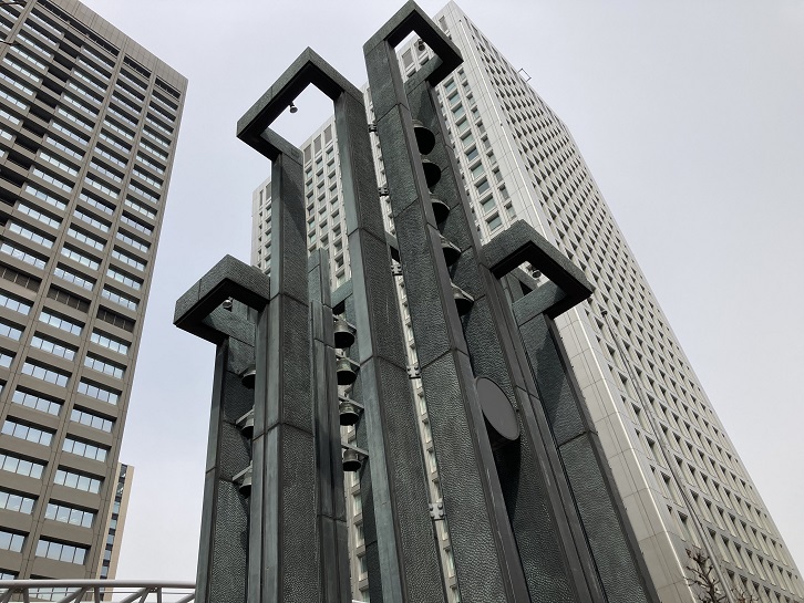 日比谷シティの前に鈴なりの鈴を付けた鉄塔が建っています。カリヨンと言うのだそうです。