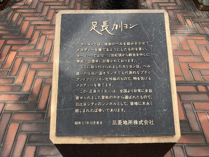 カリヨンとは、複数のベルを組み合わせてメロディーを奏でるようにしたものを言い、ヨーロッパでは10〜12世紀頃から教会を中心に学校・公園等に設置されております。ここに取り付けられましたカリヨンは、ベル造りの伝統の国オランダでも代表的なプティアンドフリッツエン社特製のもので、時を告げるメロディーを奏でます。この<足長カリヨン>は、全国より非常に多数寄せられました愛称の中から選ばれたもので、日比谷シティのシンボルとして、皆様に末永く親しまれれば幸いであります。