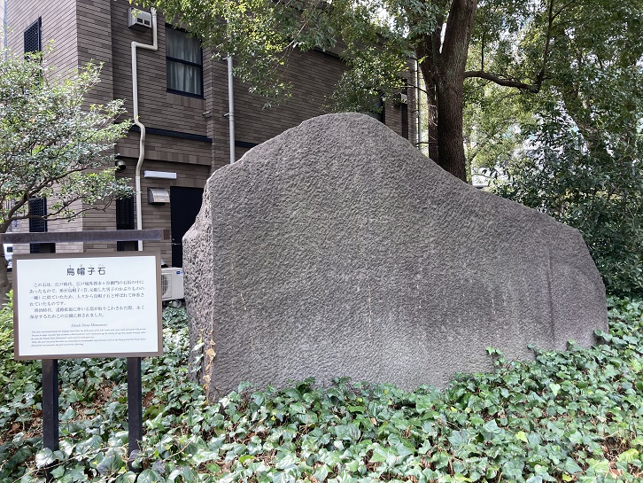 この石は、江戸時代、江戸城外郭市ヶ谷御門の石垣の中にあったもので、形が鳥帽子(昔、元服した男子のかぶりものの一種)に似ていたため、人々から鳥帽子石と呼ばれて珍重されていたものです。明治時代、道路拡張に伴い石塁が取りこわされた際、永く保存するためこの公園に移されました。