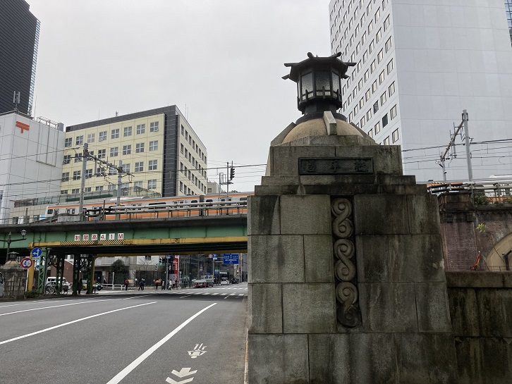 ここは、芝崎口門・神田口門・大炊殿橋門とも呼ばれ、将軍が上野寛永寺に参詣に行くための御成道となるため、門の警備は厳重でした。門は、寛永六年(1629年)に下野真岡藩(現在の栃木県)藩主稲葉正勝によって構築されました。対岸の鎌倉河岸は江戸城築城の資材を荷揚げする河岸場だったので、この門の役割は重要でした。明治六年(1873年)に櫓門が撤去され、明治十七年(1884年)に木橋が架け直されました。道路の拡張と市電の開通に伴い改修され、関東大震災で焼け落ちた後に新たに架橋されました。現在の橋は昭和五十五年(1980年)に改架されたもので、木橋風の意匠に、灯龍風の親柱、石造風の高欄を組み合わせています。