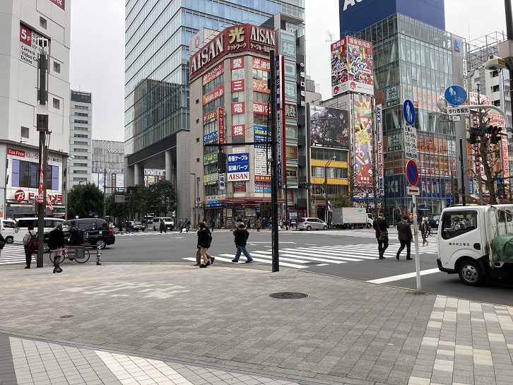 秋葉原電気街の中央通りに出ました。秋葉原は第二次世界大戦後、闇市として発展しました。高度経済成長とともに、多様な電子機器や部品を取り扱う店舗などが建ち並ぶ日本一の電気街として発展しました。その後、バブルの崩壊や大型家電量販店・ディスカウントストアの台頭などによる家電市場の衰退で電器店は主力商品をパソコンに移していきました。これによって、パソコンマニアが集中し、秋葉原は一転してオタクの街として変貌を遂げました。世界的な観光地としても注目されるようになりましたが、2010年代以降はネット販売の普及と地価上昇、それに昨今のコロナ禍などでオタク向けの小売店が軒並み閉店し、代わって大資本によるコンセプトカフェが進出し、区画整理の推進などもあって今ではオフィス街に変貌しつつあります。