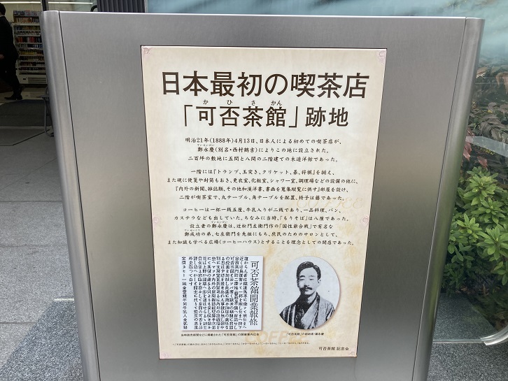 中央通りに面したビルの角に案内板が立っています。ここに日本初の喫茶店があったそうです。
