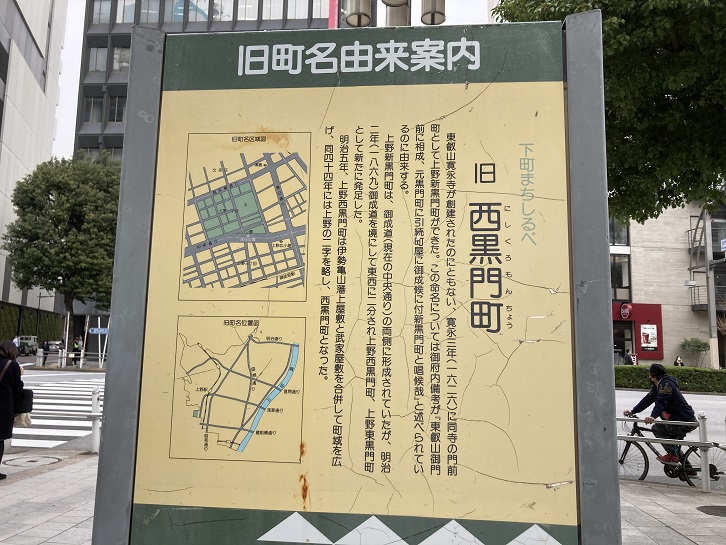 歩道脇に旧町名由来案内板が立っています。「黒門」の町名は、上野に寛永寺が創建され、その門前町として発展してきたという由来があるのでしょう。