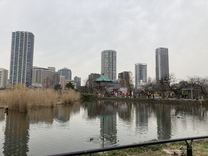 都電37系統の線路がどの辺りに敷設されていたのか分かりませんが、不忍池キワキワのところか、動物園通りとの境界線に沿っていたのではないかと思われます。当時の車内からは今林立している高層マンション群など想像もできなかったことでしょう。
