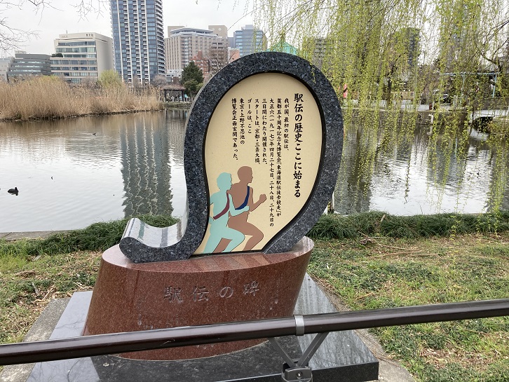 我が国、最初の駅伝は、奠都五十周年記念大博覧会「東海道駅伝徒歩競走」が大正六年(1917年)年四月二十七日・二十八日・二十九日の三日間にわたり開催された。スタートは、京都・三条大橋、ゴールは、ここ東京・上野不忍池の博覧会正面玄関であった。