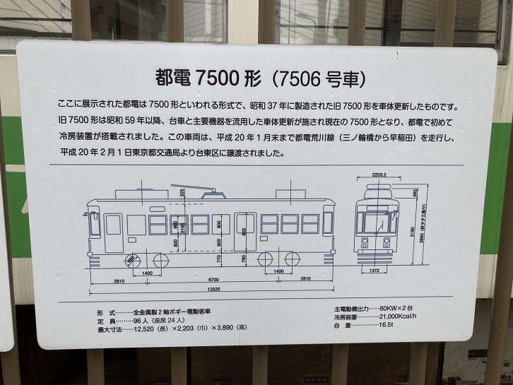 ここに展示された都電は7500形といわれる形式で、昭和三十七年に製造された旧7500形を車体更新したものです。旧7500形は昭和五十九年以降、台車と主要機器を流用した車体更新が施され(て)現在の7500形となり、都電で初めて冷房装置が搭載されました。この車両は、平成二十年1月末まで都電荒川線(三ノ輪橋から早稲田)を走行し、平成二十年2月1日東京都交通局より台東区に譲渡されました。