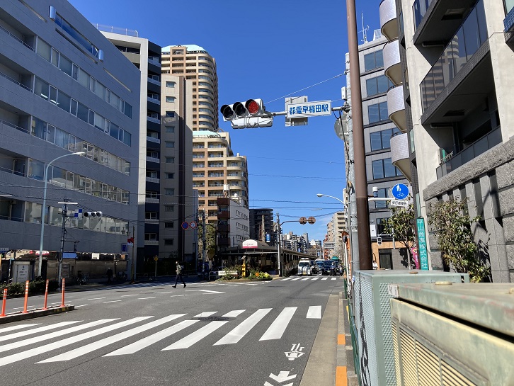 早稲田電停は三ノ輪橋電停のように、乗車と降車で線路が分かれていないので、ホームがやけに長くなっています。1本の線路の両側にホームがあり、それぞれ乗車専用と降車専用になっています。ラッシュ時には乗り降りの操作で運転手さんも忙しいでしょうね。早稲田電停は新目白通り上にあります。新目白通りは目白通りのバイパスとして計画され、昭和五十九年に全区間が開通した比較的新しい道路です。ただ、早稲田電停から江戸川橋電停までは、大正七年(1918年)に東京市電が開業していました。それまで徒歩通学しか手段のなかった早大生には大きな恵みになったそうです。