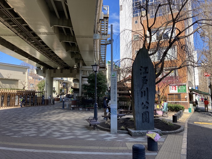 江戸川公園に入りますと、目白台の高台の突端部がすぐ北側に迫り、川沿いの桜を中心に緑が多くなっています。このあたりの神田川流域は、明治四十三年に大洪水に見舞われたといわれますが、その後の大正二年から大正八年にかけて大掛かりな護岸改修工事が行われました。江戸川公園の開園は、護岸改修完了後の大正八年で、早稲田方面への電車の開通とほぼ同時期ということになります。公園の中に記念碑が建っています。