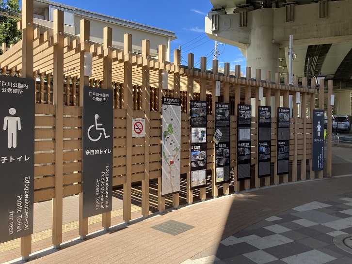 公園の入口広場にある公衆トイレ(素晴らしく綺麗)の目隠板に近隣の名所が紹介されています。