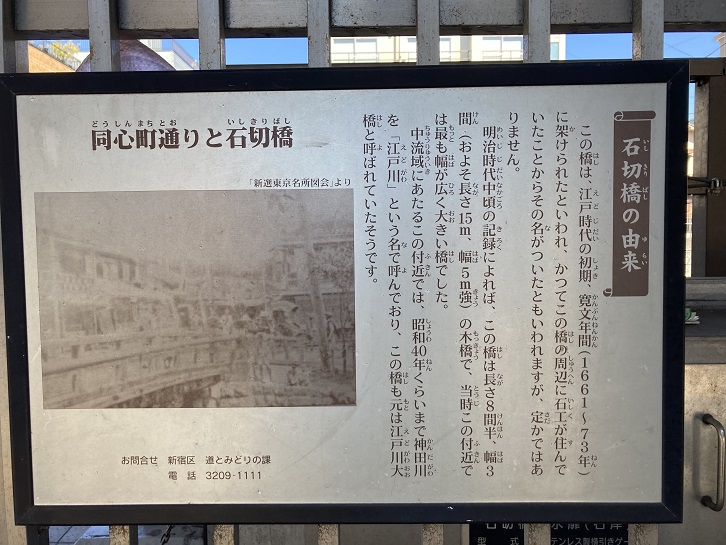 この橋は、江戸時代の初期、寛文年間(1661年〜1673年)に架けられたといわれ、かつてこの橋の周辺に石工が住んでいたことからその名がついたともいわれますが、定かではありません。明治時代中頃の記録によれば、この橋は長さ8間半、幅3間(およそ長さ15m、幅5m強)の木橋で、当時この付近では最も幅が広く大きい橋でした。中流域にあたるこの付近では、昭和四十年くらいまで神田川を「江戸川」という名で呼んでおり、この橋も元は江戸川大橋と呼ばれていたそうです。
