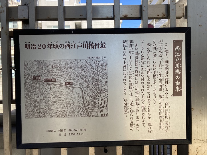 石切橋を過ぎると神田川が区の境界となり、右岸側が新宿区、左岸側が文京区となります。石切橋の次の橋が西江戸川橋です。江戸川橋から東に位置するのに「西」とは不思議ですが、橋名は神田川左岸に昭和三十九年まで西江戸川町の町名があったことに由来します。神田川には江戸川の別称がありましたが、この先の大曲から下流方向の川沿いにはかつては江戸川町の町名があり、その西隣りということで西江戸川町となりました。橋の袂に案内板が立っています。案内板には明治期の地図が添えられています。