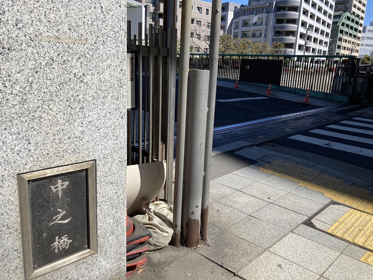 この橋が架けられた時期は明確ではありませんが、江戸時代初期に(1670年頃)刊行された「寛文江戸図」の中には無名ながらこの橋を見つけることができます。当時はまだ現在のようにたくさんの橋はなかったので、この橋が下流側の隆慶橋と上流側の石切橋の間にあることになり、「中之橋」と名が付けられたといいます。明治時代中頃、この橋を挟む両岸一帯に桜が植えられ、明治末頃まで、東京市内屈指の桜の名所として知られていました。