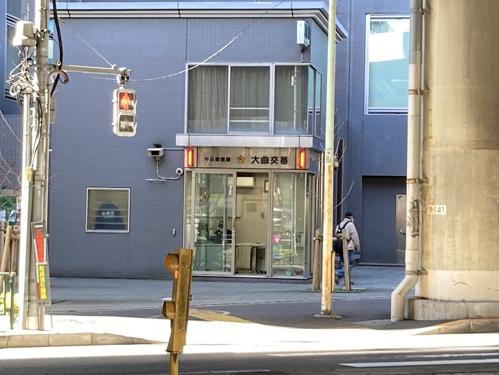 「大曲」は、交差点だけでなく交番の名前にも残っています。