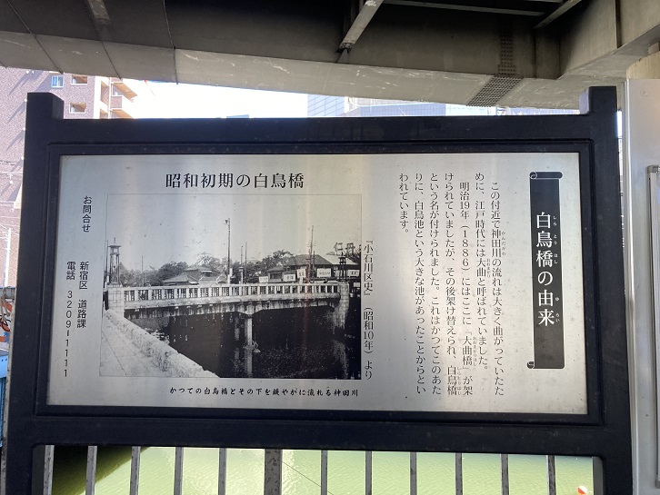 この付近で神田川の流れは大きく曲がっていたために、江戸時代には大曲と呼ばれていました。明治十九年(1886年)にはここに「大曲橋」が架けられていましたが、その後架け替えられ、白鳥橋という名が付けられました。これはかつてこのあたりに、白鳥池という大きな池があったことからといわれています。