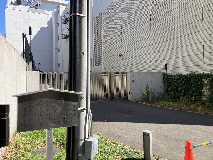 白鳥橋を渡った先のビルの裏手に小さなスペースがあり、そこに同人社跡の案内板が立っています。