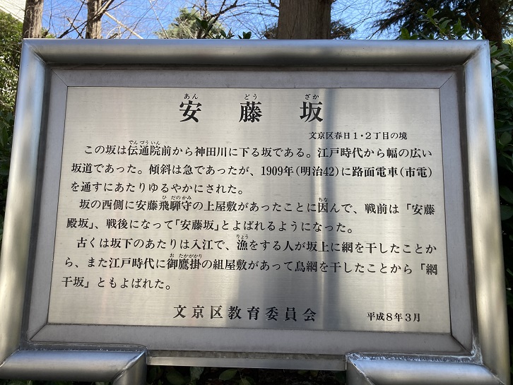 目白通りの大曲交差点から大きなカーブを描いて伝通院へと登っていくのが安藤坂です。安藤坂の名前の由来は、江戸時代に坂の西側に安藤飛騨守(紀州藩家老)の上屋敷があったことに因みます。当時は「安藤殿坂」とも呼ばれ、伝通院へと真っ直ぐ続く参道となっていました。安藤坂が急坂だったため、明治後期に路面電車を通す際にループ式にしないと坂を登れず、新たに開削して今のようなカーブになったとのことです。