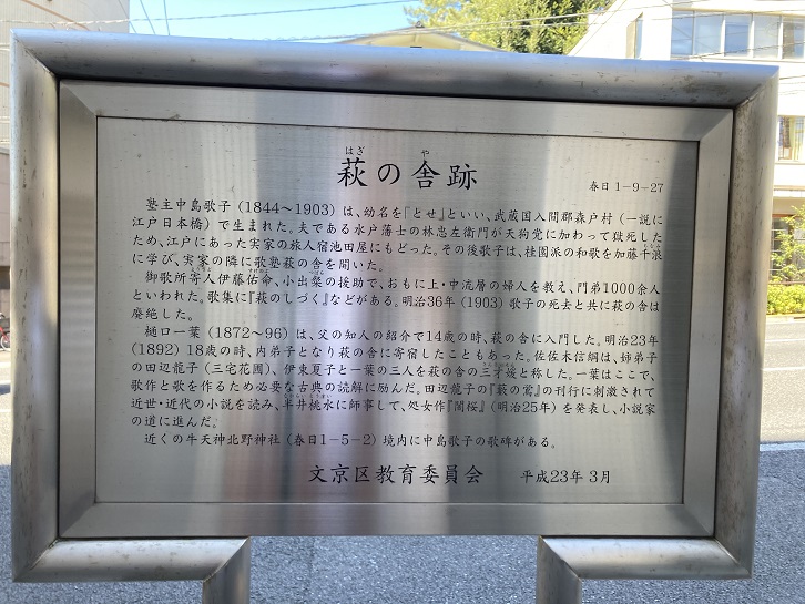 塾主中島歌子(1844年〜1903年)は、幼名を「とせ」といい、武蔵国入間郡森戸村(一説に江戸日本橋)で生まれた。夫である水戸藩士の林忠左衛門が天狗党に加わって獄死したため、江戸にあった実家の旅人宿池田屋にもどった。その後歌子は、桂園派の和歌を加藤千浪に学び、実家の隣に歌塾萩の舎を開いた。御歌所寄人伊藤佑命、小出桑の援助で、おもに上・中流層の婦人を教え、門弟1000余人といわれた。歌集に「萩のしづく」などがある。明治三十六年(1903年)歌子の死去と共に萩の舎は廃絶した。樋口一葉(1872年〜1896年)は、父の知人の紹介で14歳の時、萩の舎に入門した。明治二十三年(1892年)18歳の時、内弟子となり萩の舎に寄宿したこともあった。佐佐木信綱は、姉弟子の田辺龍子(三宅花圃)、伊東夏子と一葉の三人を萩の舎の三才媛と称した。一葉はここで、歌作と歌を作るため必要な古典の読解に励んだ。田辺龍子の「藪の鴬」の刊行に刺激されて近世・近代の小説を読み、半井桃水に師事して、処女作「闇桜」(明治二十五年)を発表し、小説家の道に進んだ。近くの牛天神北野神社(春日1−5−2)境内に中島歌子の歌碑がある。
