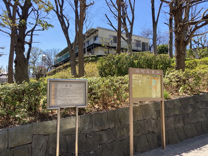 中央大学理工学部から文京区役所が入る文京シビックセンターの手前までの割と急な下り坂が富坂です。その横手に礫川公園があります。石垣の前に2枚の案内板が立っています。