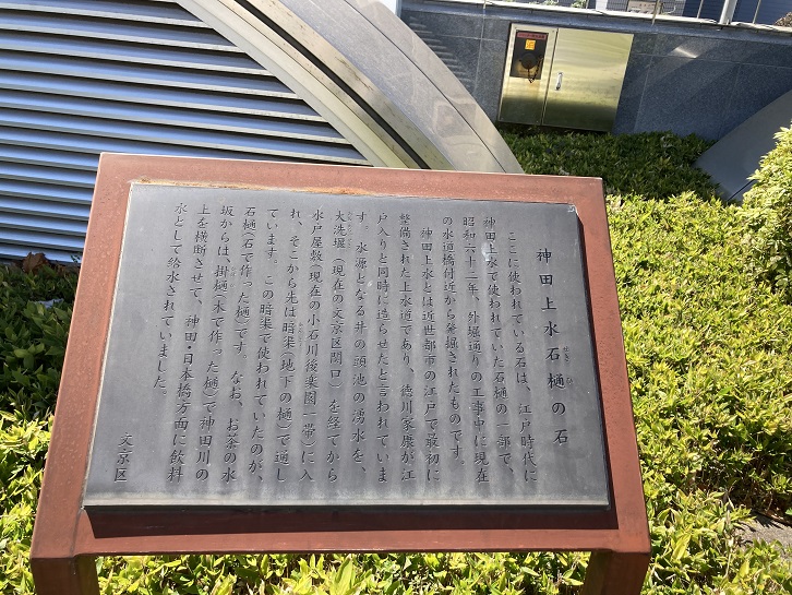 ここに使われている石は、江戸時代に神田上水で使われていた石樋の一部で、昭和六十二年、外堀通りの工事中に現在の水道橋付近から発掘されたものです。神田上水とは近世都市の江戸で最初に整備された上水道であり、コ川家康が江戸入りと同時に造らせたと言われています。水源となる井の頭池の湧水を、大洗堰(現在の文京区関口)を経てから水戸屋敷(現在の小石川後楽園一帯)に入れ、そこから先は暗渠(地下の樋)で通しています。この暗渠で使われていたのが、石樋(石で作った樋)です。なお、お茶の水坂からは、掛樋(木で作った樋)で神田川の上を横断させて、神田・目本橋方面に飲料水として給水されていました。