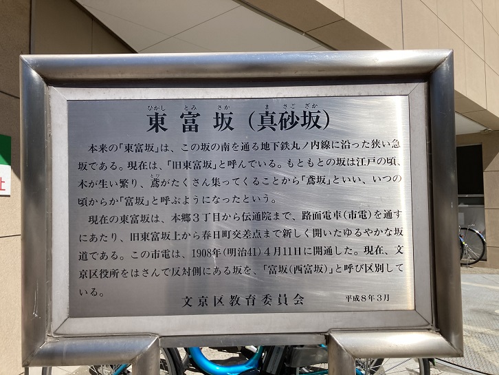 春日町交差点を谷底として、春日通りは前後が坂道になっています。電通院から下りてくる坂は「富坂」ですが、本郷に向かって上る先は「真砂坂」と呼ばれます。坂下に案内板が立っています。