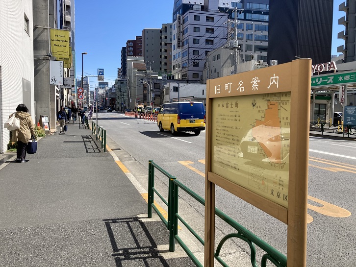 本郷三丁目交差点で本郷通りと交差します。この地域はかって本富士町と呼ばれていました。