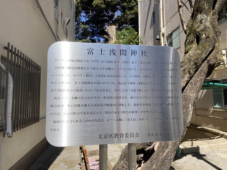 かつてこの地は明治五年(1872年)から昭和四十年(1965年)まで「本富士町」という町名であった。加賀藩本郷邸の跡地にたつ東京大学本郷キャンパスにおいて、その名残を今にとどめる赤門を入って右手に、かつて「椿山」と呼ばれる小丘があった。江戸時代、「椿山」は「富士山」・「富士塚」などと呼ばれ、富士浅間神社が祀られていた。駒込富士神社(本駒込5−7−20)は、この本郷の富士浅間神社から勧請したという伝承を有し、そのことが「本富士町」という町名の由来ともなった。明治四年、本郷の富士山やその一帯は国に接収され、祀られていた富士浅間神社は旧加賀藩邸の南西一角に屋敷を構えた前田家の敷地内に移転した。前田家が昭和三年に駒場へ移転したのちは、地元の町会である本富士会(現在の本富士町会の前身)の管理下に移された。地域住民に守られるこの小さな社は、かつて本郷に「富士山」があったことを物語る唯一の場所である。