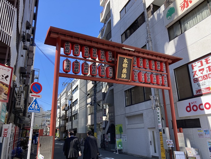 本郷三丁目交差点の脇から続く参道入口に「本郷薬師」の赤い門が建っています。路地の奥を更に右手に入った先にありますので、普段交差点を通る人の目には触れることはないでしょう。本郷薬師には、十一面観世音菩薩が立っておわしますそうです。