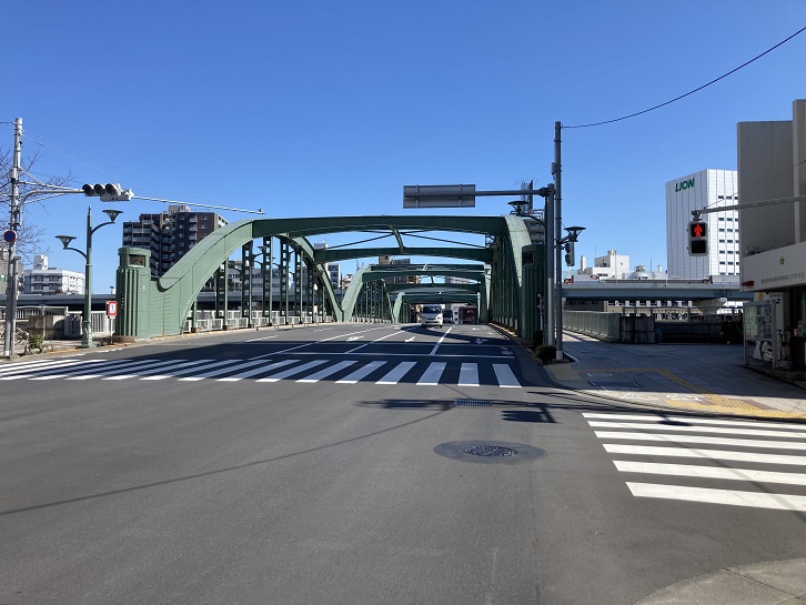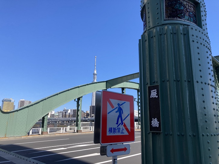 厩橋は三連のタイドアーチからなる橋です。現在の橋は関東大震災後に復興事業として架けられました。蔵前と本所を渡した厩橋は明治時代に初めて架けられましたが、江戸時代には渡船が往き来していました。この付近の隅田川沿いの河岸地を御厩河岸と呼びましたが、これは幕府の厩があったことによるもので、江戸っ子は御厩を「おんまい」と発音したといわれています。初代の厩橋は木橋で、明治二十八年から二代目の鉄橋となり、その10年後の明治三十八年から電車が橋を渡るようになりました。アーチは架線を取り付けるには便利そうに見えますね。