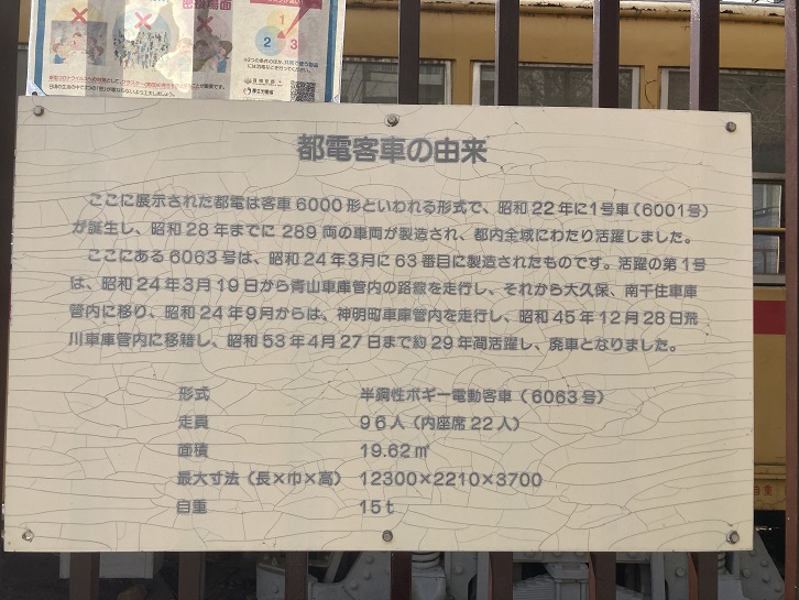 ここに展示された都電は客車6000形といわれる形式で、昭和二十二年に1号車(6001号)が誕生し、昭和二十八年までに289両の車両が製造され、都内全域にわたり活躍しました。ここにある6063号は、昭和二十四年3月に63番目に製造されたものです。活躍の第1号は、昭和二十四年3月19日から青山車庫管内の路線を走行し、それから大久保、南千住車庫管内に移り、昭和二十四年9月からは、神明町車庫管内を走行し、昭和四十五年12月28日荒川車庫管内に移籍し、昭和五十三年4月27日まで約29年間活躍し、廃車となりました。