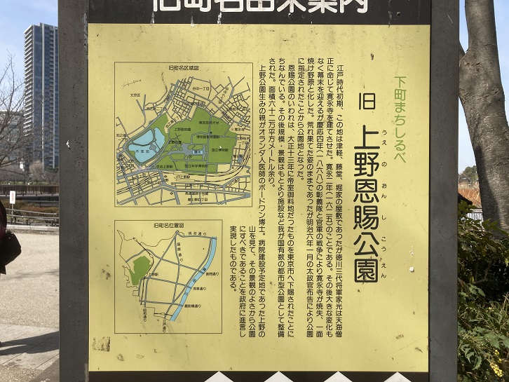 公園の入口に旧町名由来案内板が立っています。「上野恩賜公園」というのが町名だったんですね。実際には住民はいなかったと思いますが。