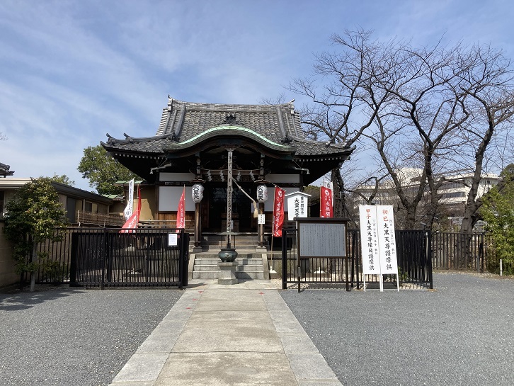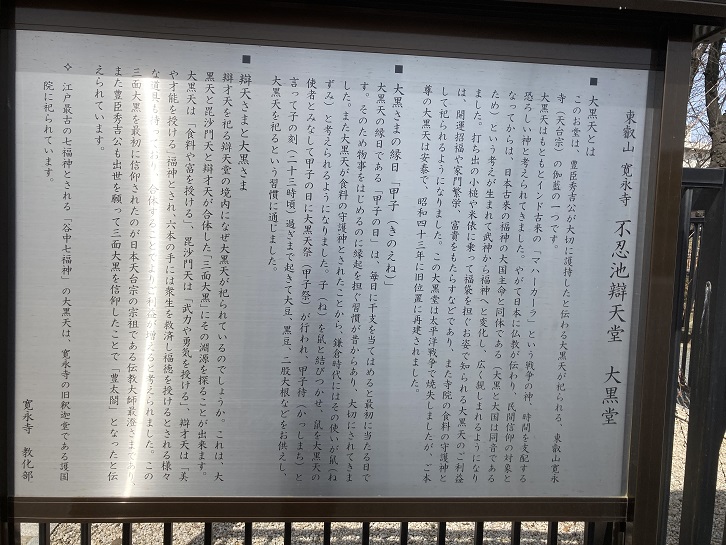このお堂は、豊臣秀吉公が大切に護持したと伝わる大黒天が祀られる、東叡山寛永寺(天台宗)の伽藍の一つです。大黒天はもともとインド古来の「マハーカーラ」という戦争の神、時間を支配する恐ろしい神と考えられてきました。やがて日本に仏教が伝わり、民間信仰の対象となってからは、日本古来の福神の大国主命と同体である(大黒と大国は同音であるため)という考えが生まれて武神から福神へと変化し、広く親しまれるようになりました。打ち出の小槌や米俵に乗って福袋を担ぐお姿で知られる大黒天のご利益は、開運招福や家門繁栄、富貴をもたらすなどであり、また寺院の食料の守護神として祀られるようになりました。この大黒堂は太平洋戦争で焼失しましたが、ご本尊の大黒天は安泰で、昭和四十三年に旧位置に再建されました。