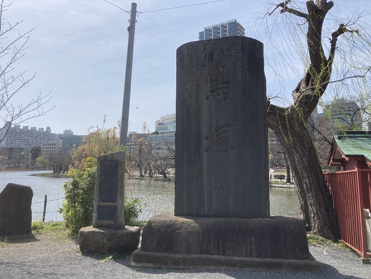 不忍池の辺に石造りの記念碑が建っています。日本で最初の駅伝が行われたことが記されています。ちなみに、奠都(てんと)とは、新たに都を定める事をいいます。明治維新に際して、明治天皇が京都から東京に移った時は、京都を都として残す形をとり、遷都(せんと)ではなく、東京奠都が行われました。