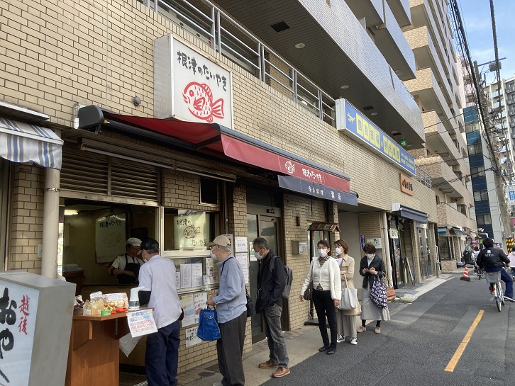 つつじが有名な根津神社の近くに、行列が出来ている一軒のたい焼き屋さんがあります。店名は「根津のたい焼き」とあります。最近、たい焼きのチェーン店はあちこちで見かけますが、「根津」を冠しているということは当地のみのお店なのでしょう。ネットには、「たい焼き史上最高の味」とのコメントが寄せられています。60年以上もの歴史があり、たい焼きの皮には一切卵を使用していないそうで、非常に薄皮でパリパリとしていて食べた時の食感が良いそうです。尻尾までねっとりした甘さが控えめな粒あんが詰まっていて、最後まで美味しく食べれるとのこと。10時〜14時の営業時間中はいつも行列が絶えないそうです。一匹買えばよかったなぁ。