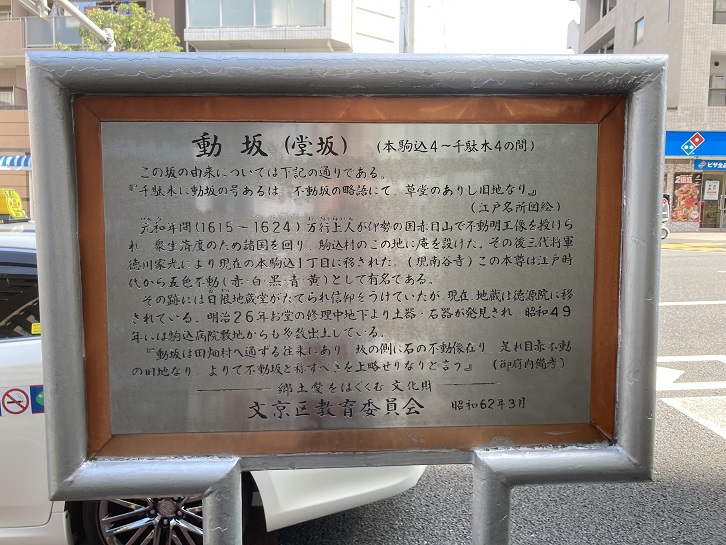 この坂の由来については下記の通りである。「千駄木に動坂の号あるは、不動坂の略語にて、草堂ありし旧地なり」(江戸名所図絵)