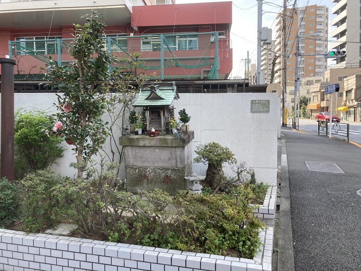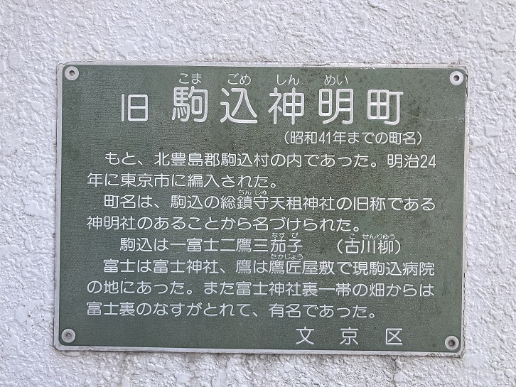 歩道に面して小さな広場があり、ミニチュアのような社が鎮座しています。壁には駒込神明町の案内プレートが貼り付けてあります。