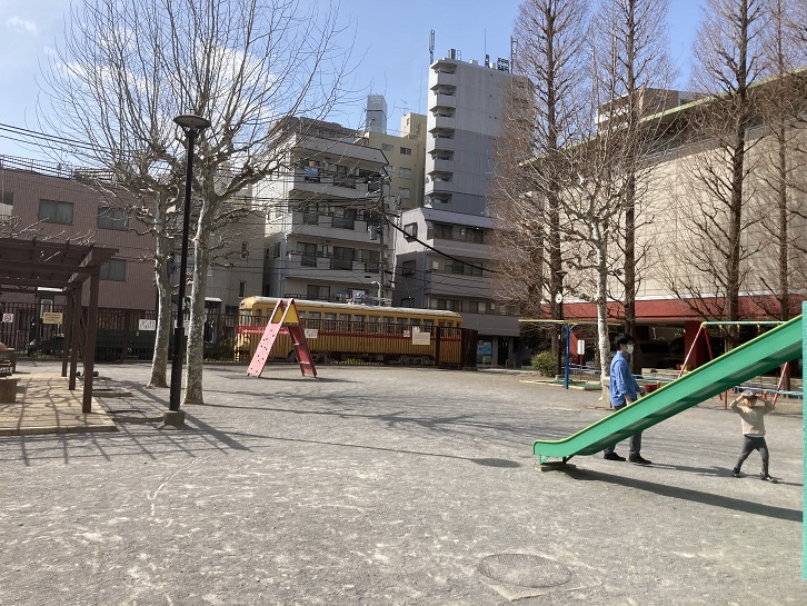 それと、跡地の一部を公園として活用する例も多くあります。神明都電車庫跡も、一部が公園になっています。神明都電車庫跡公園には、実際に使われた電車が保存・展示されています。電車の大きさと比べて、公園の敷地の広さが目立ちます。