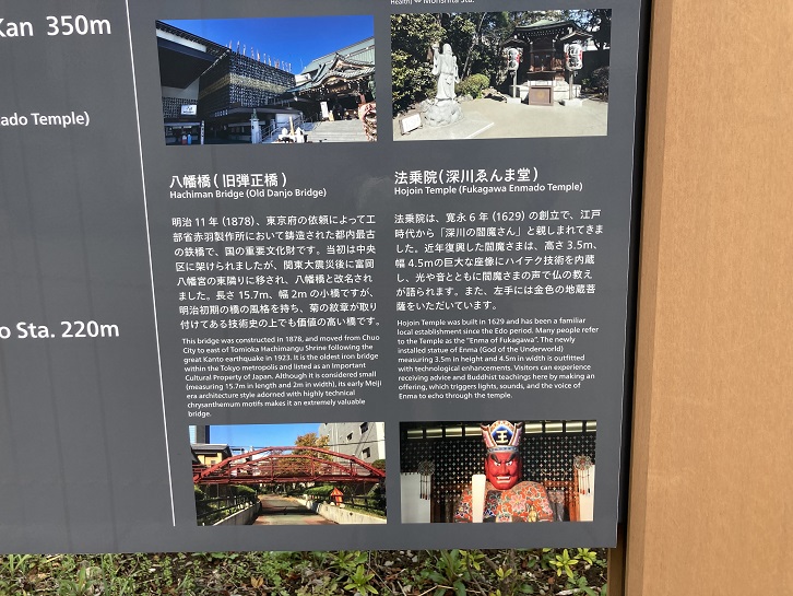 Hojoin Temple was built in 1629 and has been a familiar local establishment since the Edo period. Many people refer to the Temple as the "Enma of Fukagawa". The newly installed statue of Enma (God of the Underworld) measuring 3.5m in height and 4.5m in width is outfitted with technological enhancements. Visitors can experience