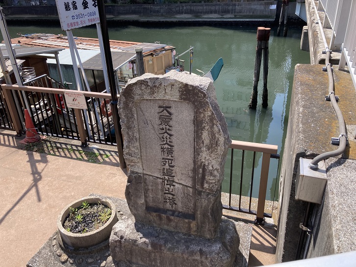 月島橋の袂に古びた石碑があります。碑面には、「大震火災横死追悼之塔」と書いてあります。関東大震災による火災から逃れようと隅田川に飛び込んで犠牲になった人々の慰霊碑だそうです。「横死(おうし)」とは、災禍などのために天命を全うしないで死ぬことです。