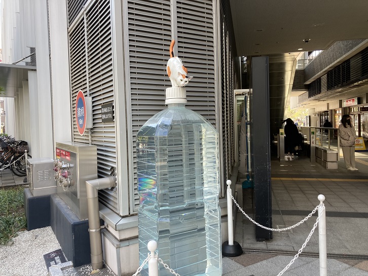 交差点角に位置する超高層マンションの1階には各種の店舗が入っています。巨大なペットボトルの蓋の上に立つ猫は何を狙っているのでしょうか?モールの中には「かねます」があります。立ち飲み屋さんですが、お料理のレベルはあの伝説の料理人であるはエル・ブジの料理長フェラン・アドリアでさえも虜にしたとか。北千住の「徳多和良」と並ぶ立ち飲みの名店です。