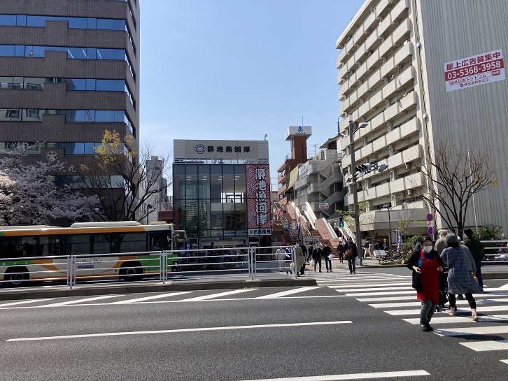 隅田川を渡りますと築地に入ります。つい最近まで鮮魚を運ぶトラックが忙しく走り回っていましたが、豊洲移転後日が経つにつれ場内市場は更地となって人影もまばらとなってきました。市場内の建物は解体が終わり、今残っているのは駐車場と築地市場厚生会館くらいなものです。一方で、築地場外市場には新しい築地魚河岸なる施設もオープンしています。新旧様変わりです。