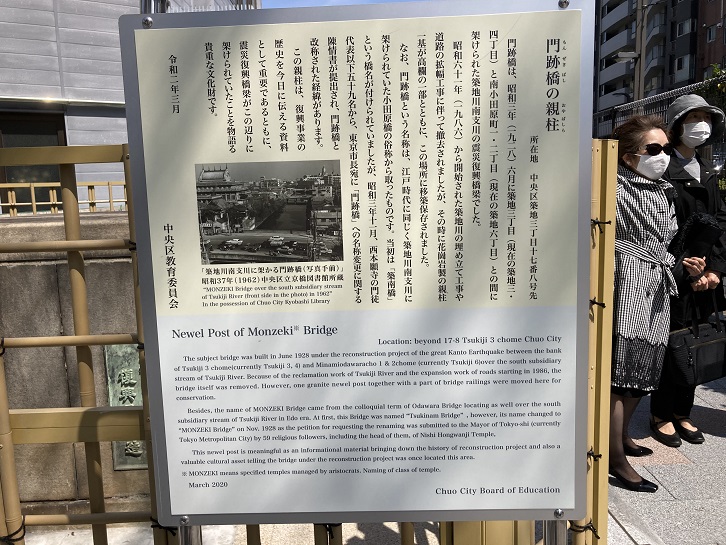 The subject bridge was built in June 1928 under the reconstruction project of the great Kanto Earthquake between the bank of Tsukiji 3 chome(currently Tsukiji 3, 4) and Minamiodawaracho 1 & 2chome (currently Tsukiji 6)over the south subsidiary stream of Tsukiji River. Because of the reclamation work of Tsukiji River and the expansion work of roads starting in 1986, the bridge itself was removed. However, one granite newel post together with a part of bridge railings were moved here for conservation. Besides, the name of MONZEKI Bridge came from the colloquial term of Odawara Bridge locating as well over the south subsidiary stream of Tsukiji River in Edo era. At first, this Bridge was named "Tsukinam Bridge" , however, its name changed to “MONZEKI Bridge" on Nov. 1928 as the petition for requesting the renaming was submitted to the Mayor of Tokyo-shi (currently Tokyo Metropolitan City) by 59 religious followers, including the head of them, of Nishi Hongwanji Temple, This newel post is meaningful as an informational material bringing down the history of reconstruction project and also a valuable cultural asset telling the bridge under the reconstruction project was once located this area.