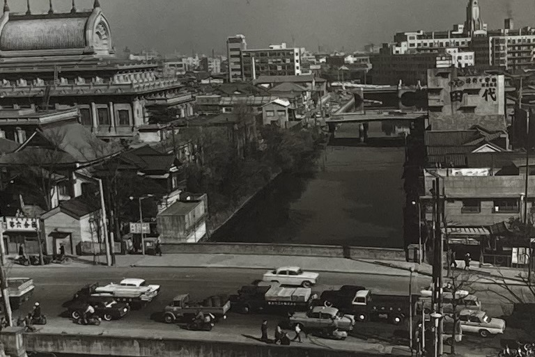 "MONZEKI Bridge over the south subsidiary stream of Tsukiji River (front side in the photo) in 1962"