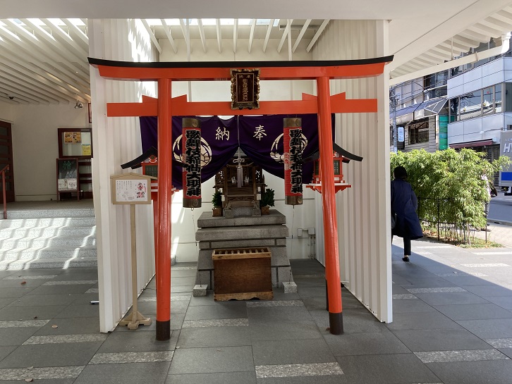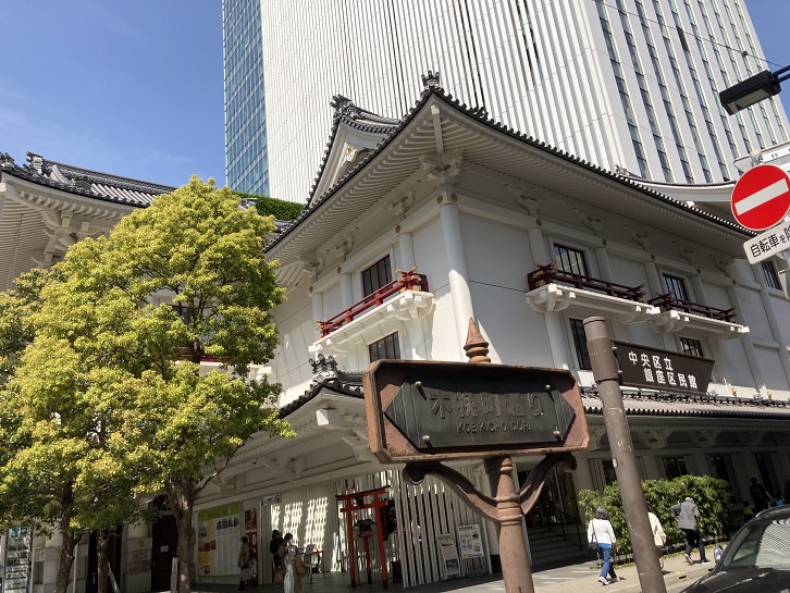 歌舞伎座の敷地の隅に赤い鳥居のミニ神社が祀られています。神社名は「歌舞伎稲荷神社」となっています。歌舞伎稲荷神社は、もともと歌舞伎座の中にあり、歌舞伎俳優・劇場関係者・歌舞伎を見るために入った方しか参拝することができませんでした。しかし、歌舞伎座の建替えに伴って、歌舞伎座の正面玄関の右側の地下鉄東銀座駅出入口エスカレーター前に遷座されました。これにより一般の方も自由に参拝できるようになりました。歌舞伎稲荷神社の御由緒や創建年代等は不明ですが、御祭神は歌舞伎稲荷大明神とされています。歌舞伎興行の安全・大入りや、観客・舞台関係者の平穏無事を祈願して祀られている神社です。また、祭祀は近くの中央区湊一丁目にある「鉄砲洲稲荷神社」の神職が行っており、こちらの御分霊を祀っているとも云われています。また、歌舞伎の初日と千穐楽に奉告祭がおこなわれます。毎年十月下旬から十一月初旬にかけて開催される「オータムギンザ」の一環として、銀座各所に祀られる小祠を巡るというイベント「銀座八丁神社めぐり」が実施されていますが、歌舞伎稲荷神社もその一社です。蛇足ですが、千穐楽(千秋楽・千穐楽・千龝樂と同意語)とは、複数日にわたって同じ演目を行う興行において「最終日」を指す業界用語です。縮めて楽日や楽ともいわれます。本来は江戸期の歌舞伎や大相撲における用語でしたが、現在では広く演劇や興行一般で用いられています。普通は「千秋楽」と書きますが、「千穐楽」など異体字での表記は「秋」の文字にある「火」を忌んで、同音にもなる音符亀に置き換えたものです。これは、江戸時代の芝居小屋は特に出火や延焼に悩まされることが多かったための忌避といわれています。